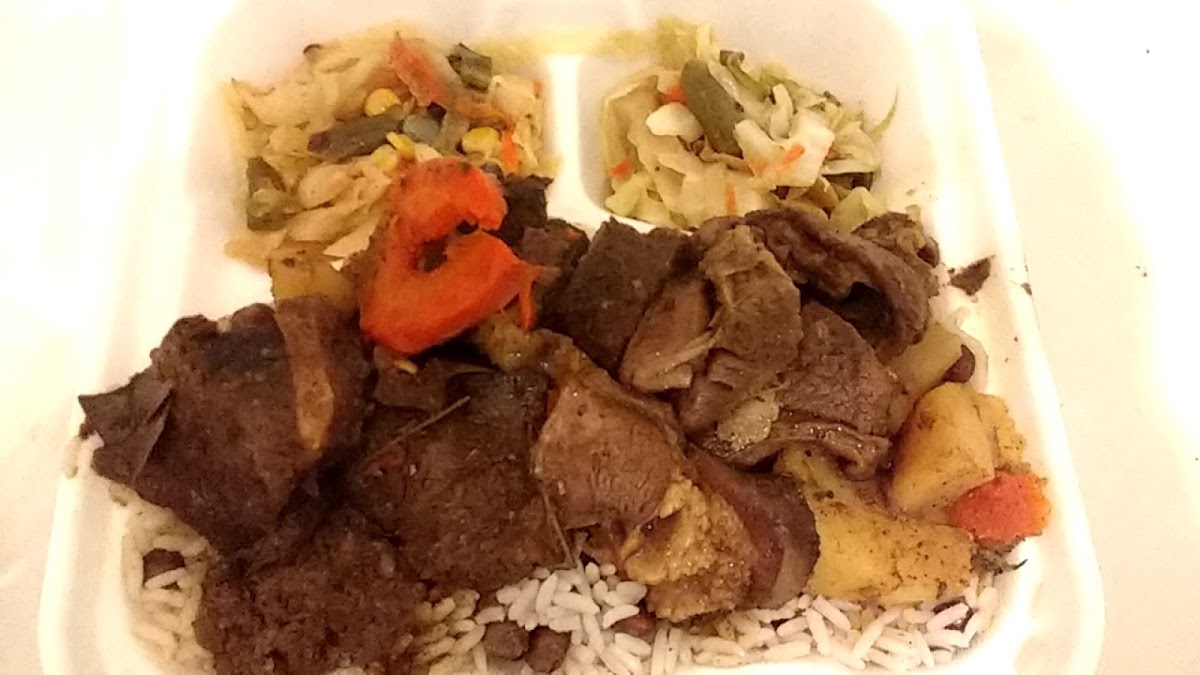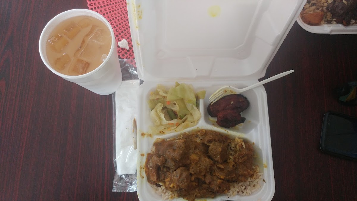 Curry Goat Rice and Peas Vegetables and Plantains with Ginger Lemonade